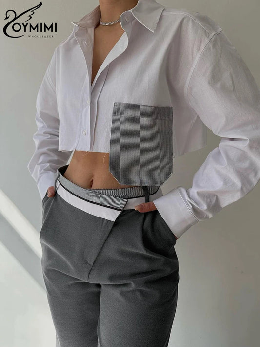Women Long Sleeve Crop Shirt + High Waist Pants Set